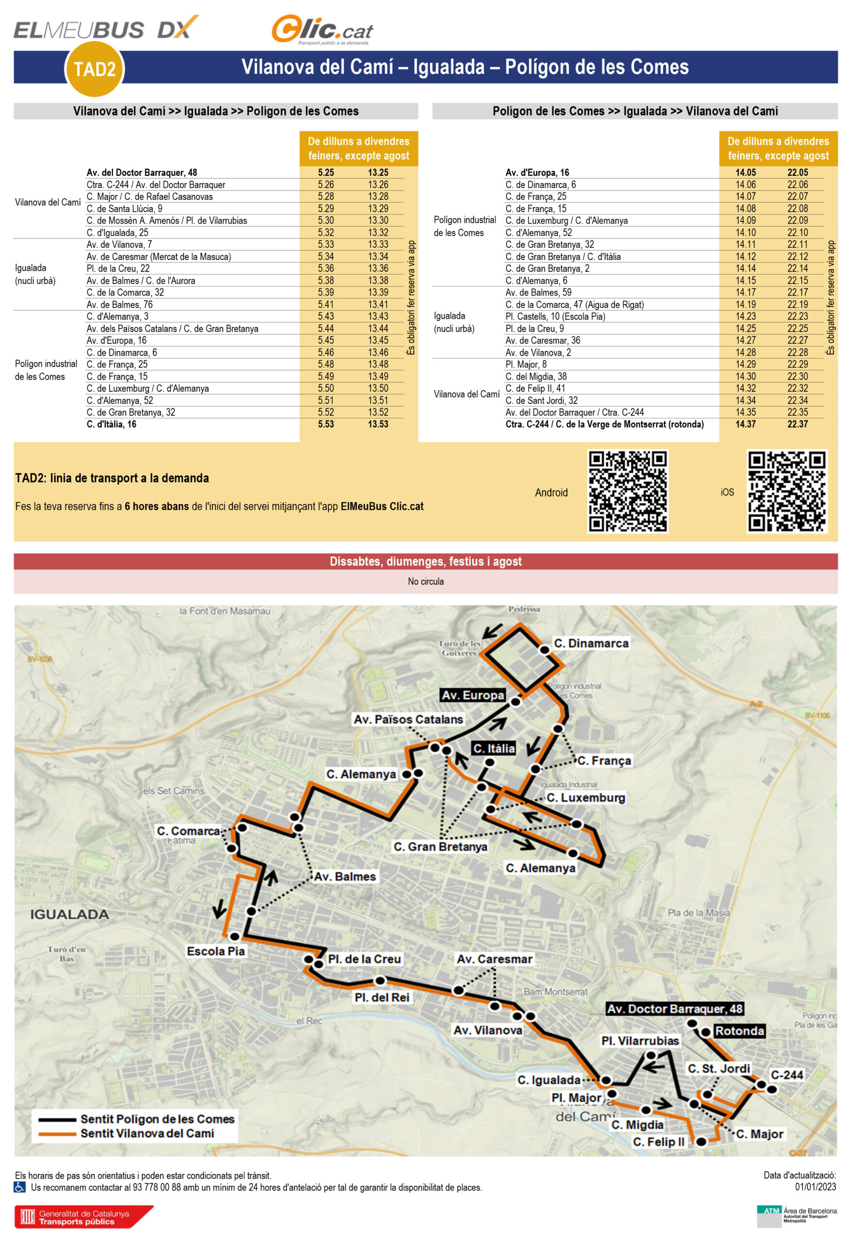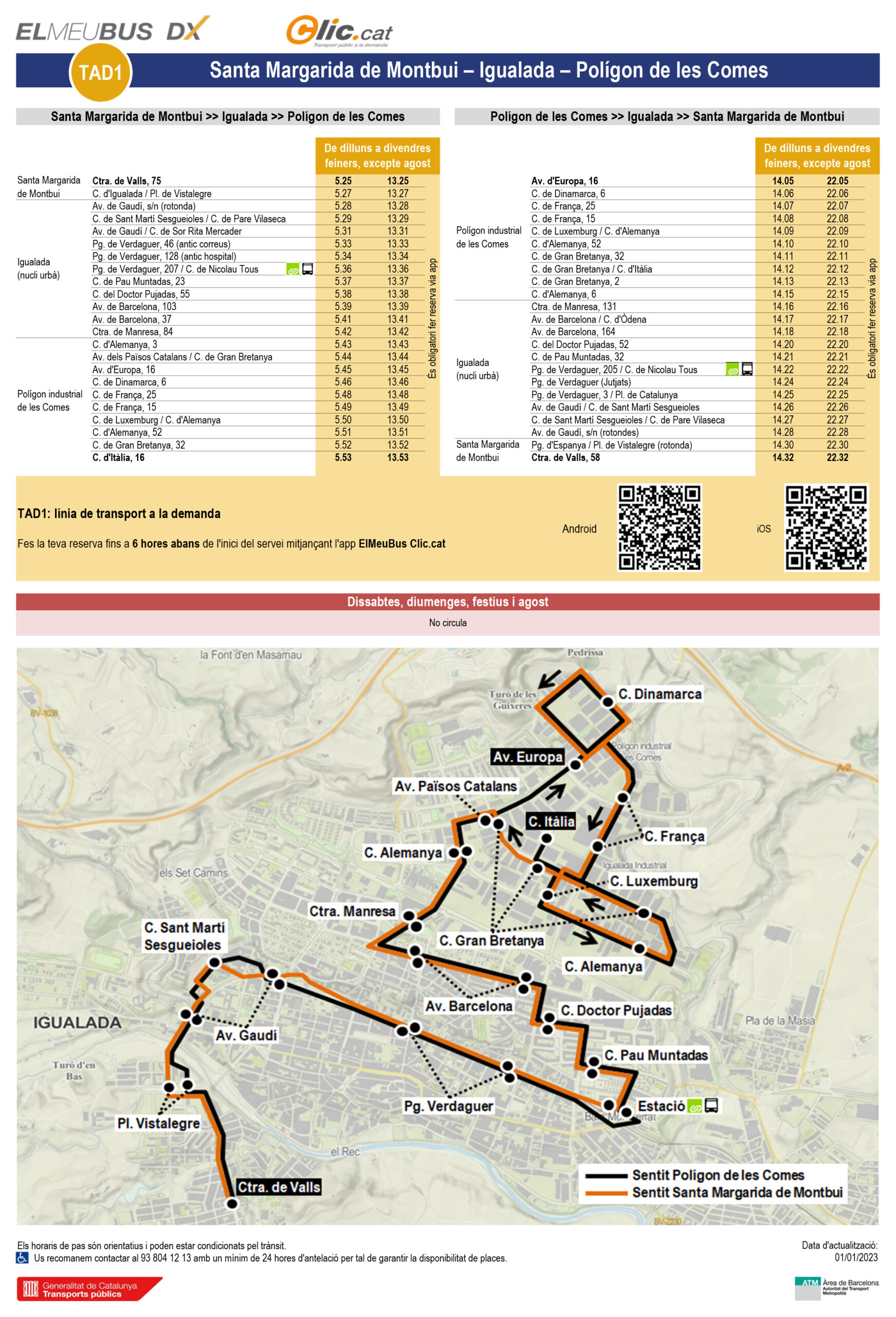 Les línies TAD1 i TAD2 uneixen els nuclis urbans d’Igualada, Santa Margarida de Montbui i Vilanova del Camí amb el polígon industrial de Les Comes. El servei es presta de dilluns a divendres feiners excepte agost.